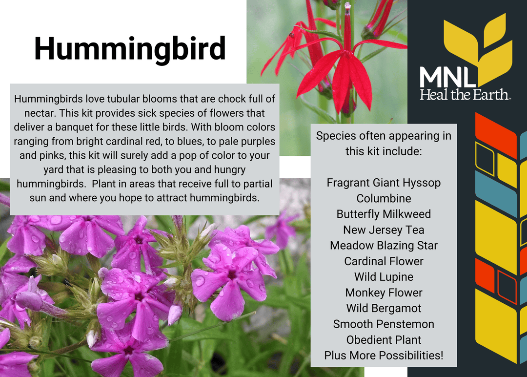 Hummingbirds love tubular blooms that are chock full of nectar. This kit provides sick species of flowers that deliver a banquet for these little birds. With bloom colors ranging from bright cardinal red, to blues, to pale purples and pinks, this kit will surely add a pop of color to your yard that is pleasing to both you and hungry hummingbirds. Plant in areas that receive full to partial sun and where you hope to attract hummingbirds.