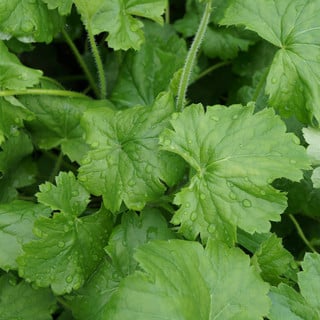 Small greenish-white flowers that form a loose spike. Foliage resembles a cluster of serrated, upside-down hearts at the ends of the flowering stalks.
